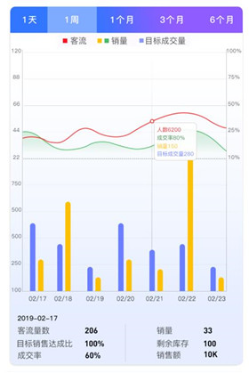 營業(yè)額是判斷經(jīng)營好壞的重要標(biāo)準(zhǔn),而只有對各項(xiàng)銷售數(shù)據(jù)進(jìn)行深入分析,才能更好地發(fā)現(xiàn)問題、解決問題。針對此,悠達(dá)智慧店鋪通過可視化圖表,對門店的銷售額、目標(biāo)成交量、客流轉(zhuǎn)化率等進(jìn)行多維度展示,每日、每周、每月各項(xiàng)報(bào)表一鍵生成,以精準(zhǔn)的數(shù)據(jù)和階段性交叉對比,幫助運(yùn)營者更清晰直觀地了解門店銷售情況,并據(jù)此做出科學(xué)的銷售決策,制定合適的績效獎(jiǎng)勵(lì)機(jī)制,激發(fā)員工銷售熱情。